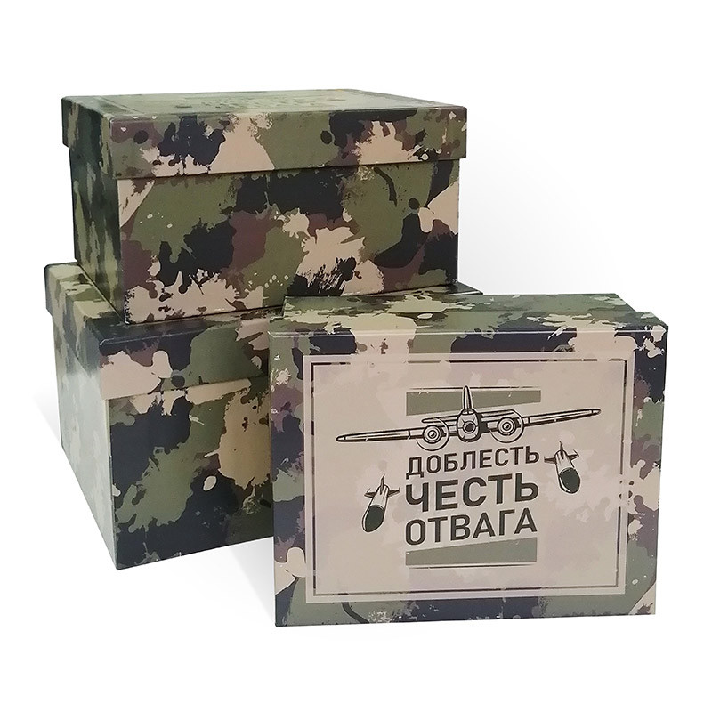 Форма: прямоугольникЦвет Упаковки: зеленыйКомплект/Набор: 3 в 1Размер Упаковки: 190х150х90Оттенок Упаковки: доблесть честь отвагаМатериал упаковки: мелованная бумага